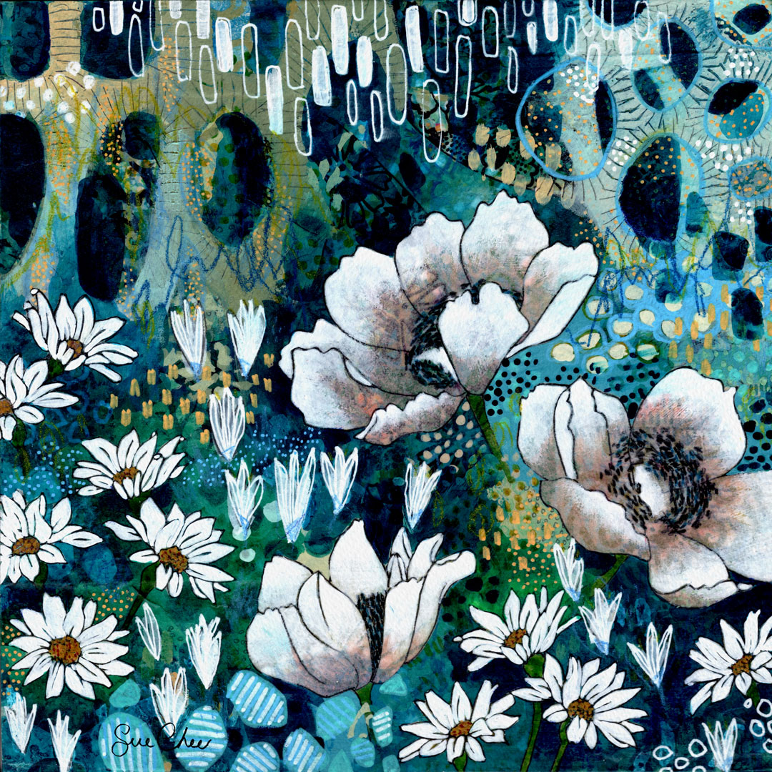 - Vary the scale of elements. Ensure that the elements in your painting vary in size. In my flower paintings I often include some large dominant flowers, which are the focal point. Then I include a different type of flower (often daisies because I love these) that is a medium size. And finally I make small abstract marks that loosely represent small or distant flowers.